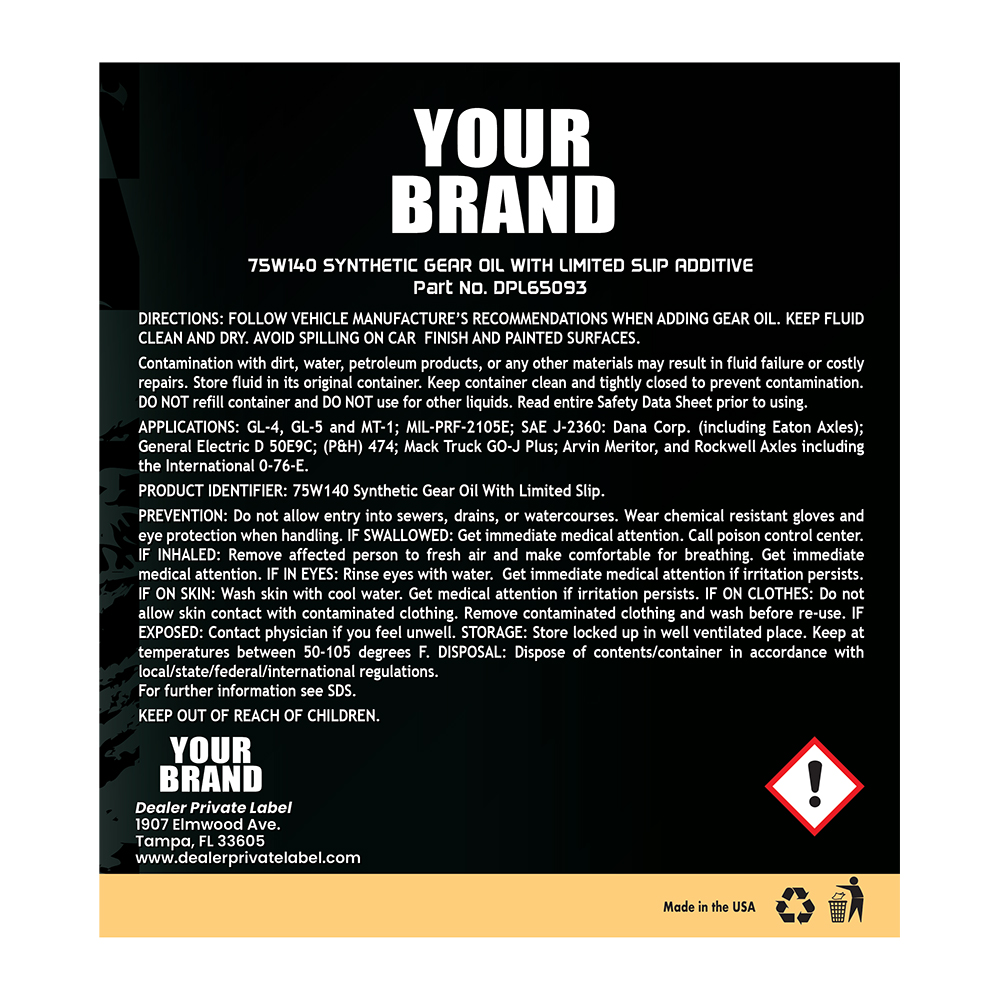 Synthetic Gear Oil 75W-140 with Limited Slip Friction Modifier is a premium, high-performance gear oil formulated to provide superior lubrication for both standard and limited-slip differentials. This advanced synthetic oil is designed to deliver maximum protection, reduce wear, and ensure smooth operation of your vehicle’s drivetrain. With its high viscosity index and the added limited-slip friction modifier, it provides excellent protection and performance under extreme temperatures and high-stress conditions, making it ideal for high-performance cars, trucks, and off-road vehicles. Synthetic Gear Oil 75W-140 with Limited Slip Friction Modifier is the perfect choice for anyone looking to maintain the performance and longevity of their differential. Whether you’re driving a high-performance car, heavy-duty truck, or off-road vehicle, this gear oil ensures your drivetrain operates smoothly and efficiently under the toughest conditions. Keep your vehicle’s gears and limited-slip differentials running like new with this advanced synthetic oil. Also available in 96oz.